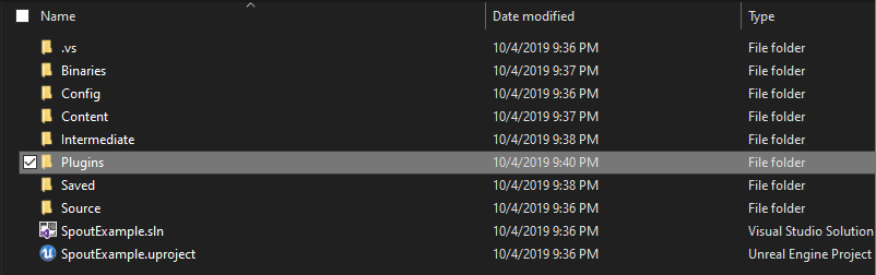 - Download the Spout-UE4 repository (zip file) and put it in the Plugins directory.