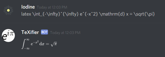 The bot takes commands in two forms. To typeset a single LaTeX expression, use latex <your code here>. For example: