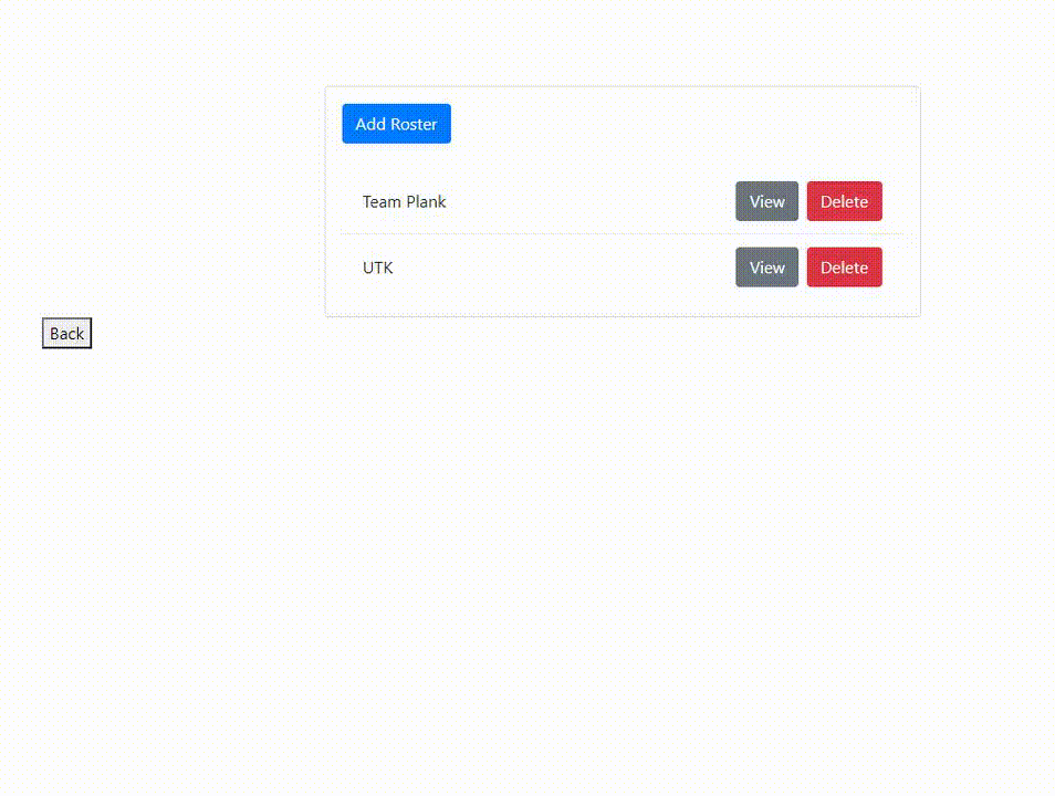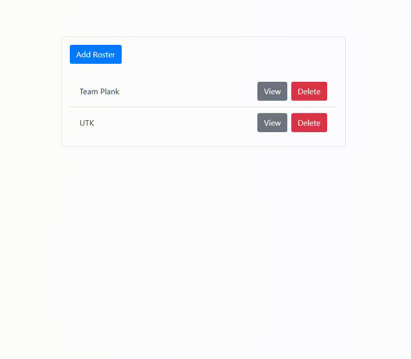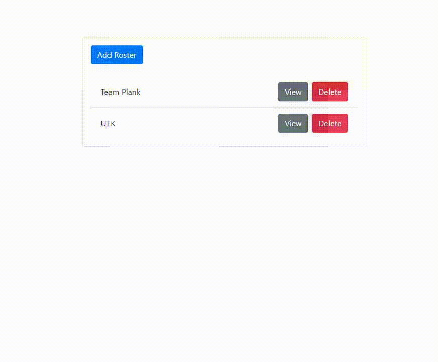 We were able to load lists of rosters and players from the database and render their details in modals using React. Here is an example of two rosters, each with a list of associated players: