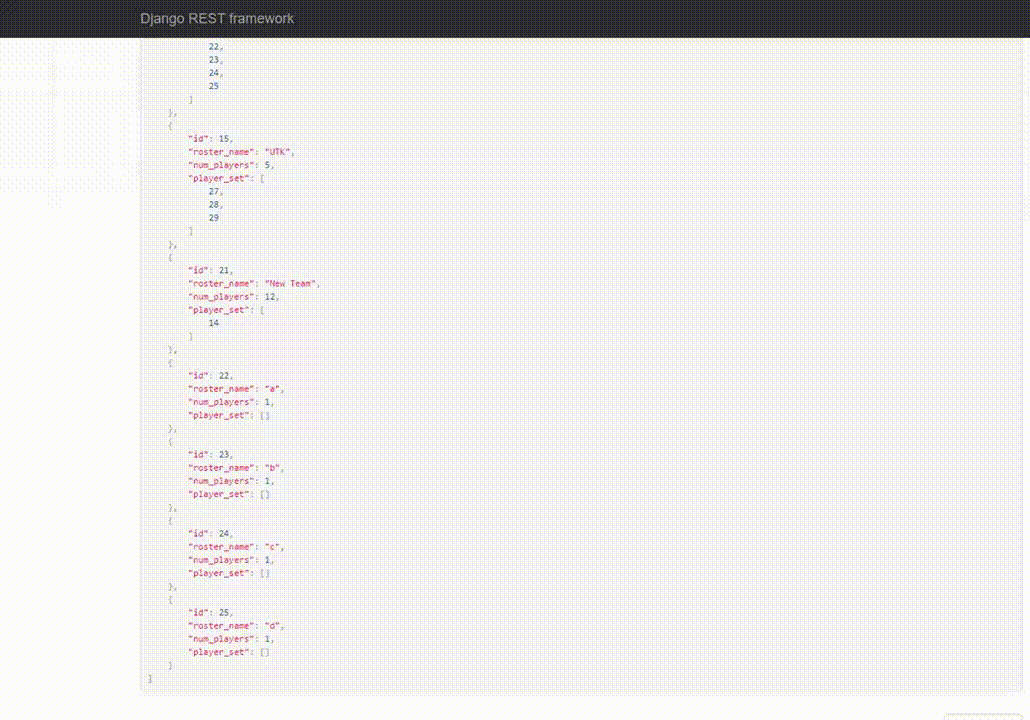 We tested the app incrementally as we implemented its different features in the same way showcased above. We constantly made use of the API to ensure that the changes we were making with the forms and buttons on the front-end were properly linked with the database. Before the front-end, Rob made a simple HTML site that accessed the Django database directly in order to test the newly-created models (Roster, Player, and Game objects). The results of our tests were two things: whether a GET/POST/PUT request was made to the server, and if so, whether the database was updated accordingly based on what we tried to do.