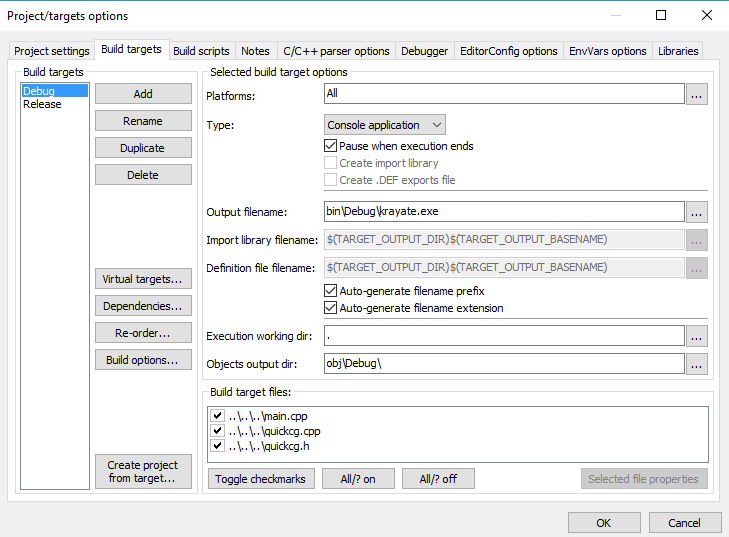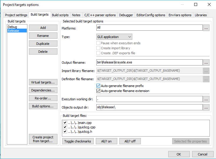 Right click the project on the left, go into Properties, Build Targets, and make it look like this for Debug and Release: