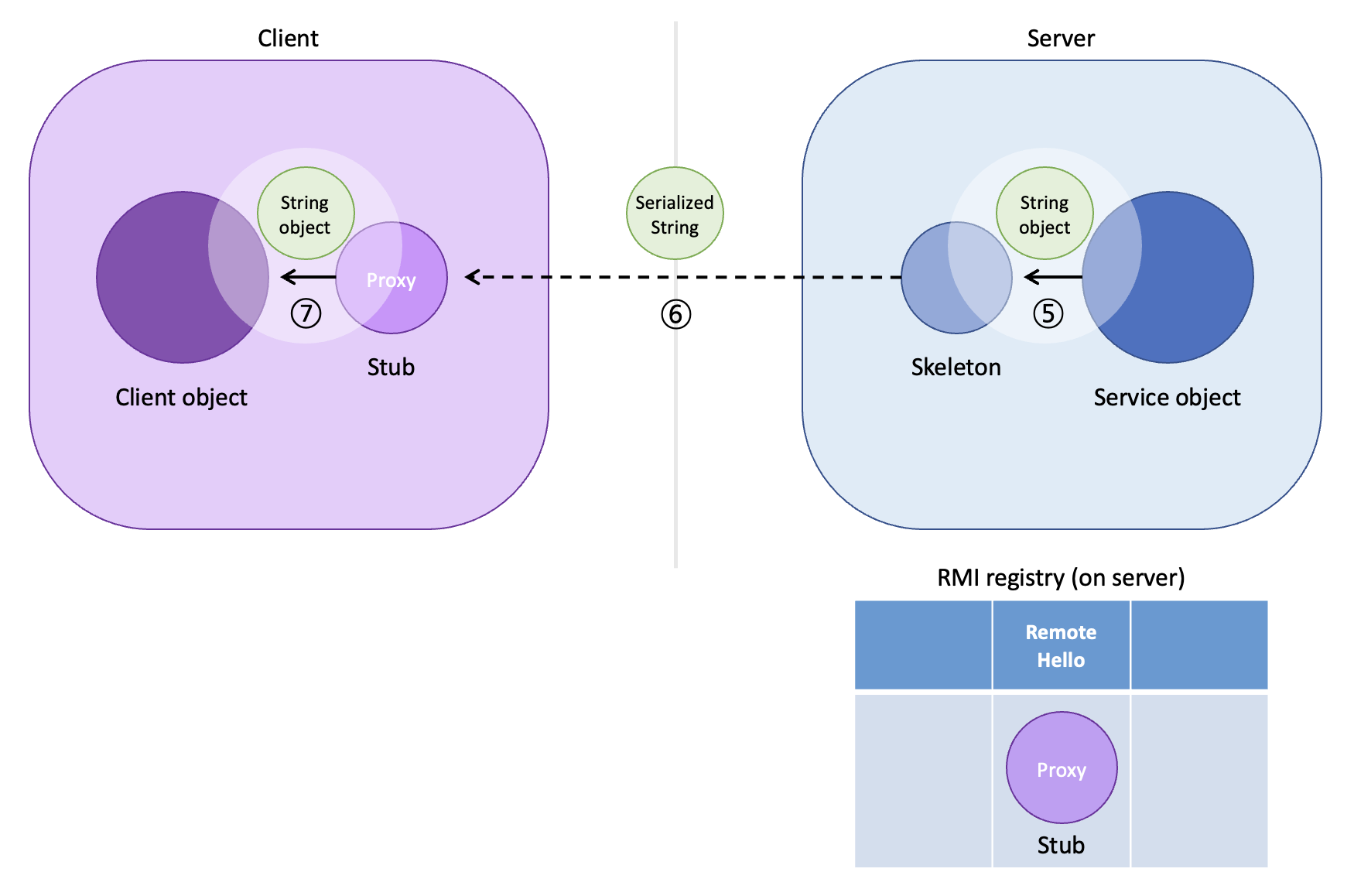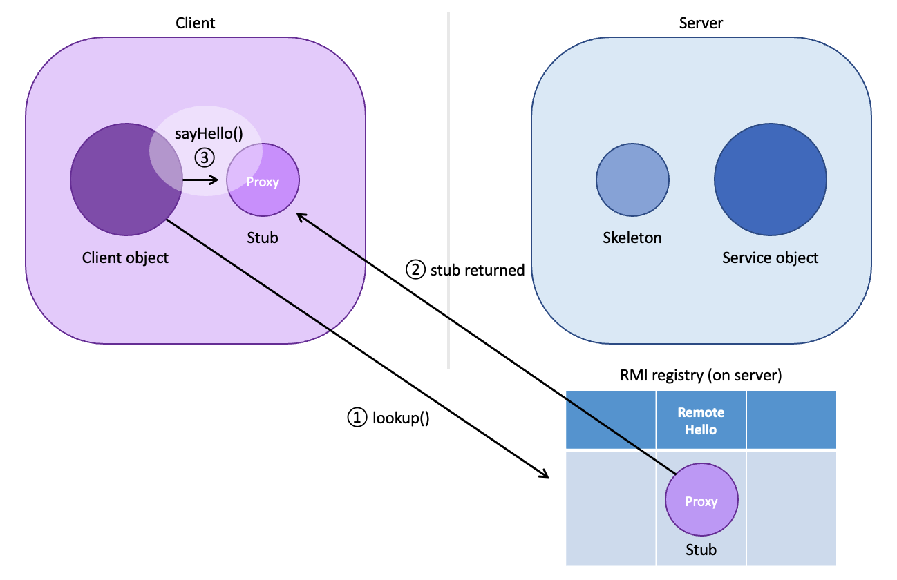 자바에서는 RMI(Remote Method Invocation, 원격 메소드 호출)를 통해 원격 JVM에 있는 객체를 찾아서 그 객체의 메소드를 호출할 수 있다.