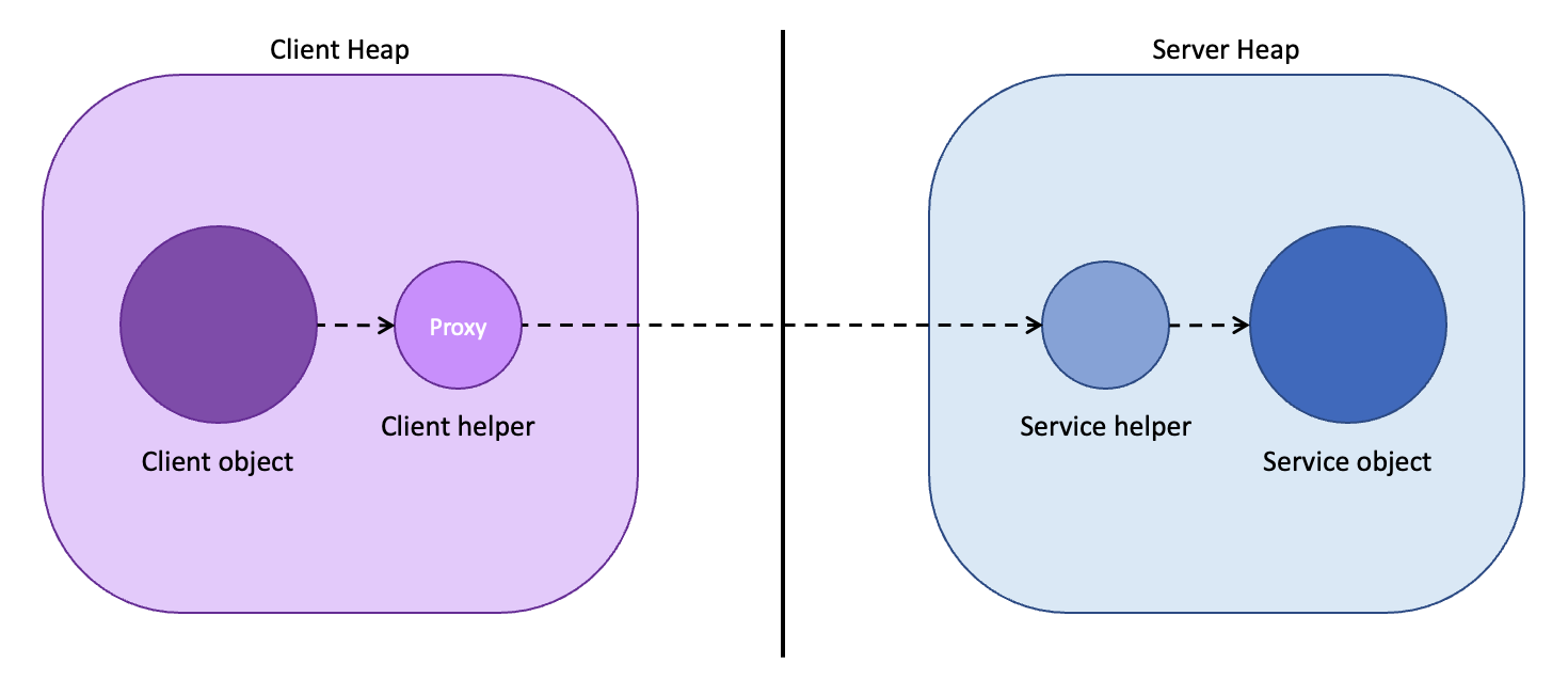 클라이언트 보조 객체(Client helper, 즉 프록시 객체)는 서버에 연락을 취하고,