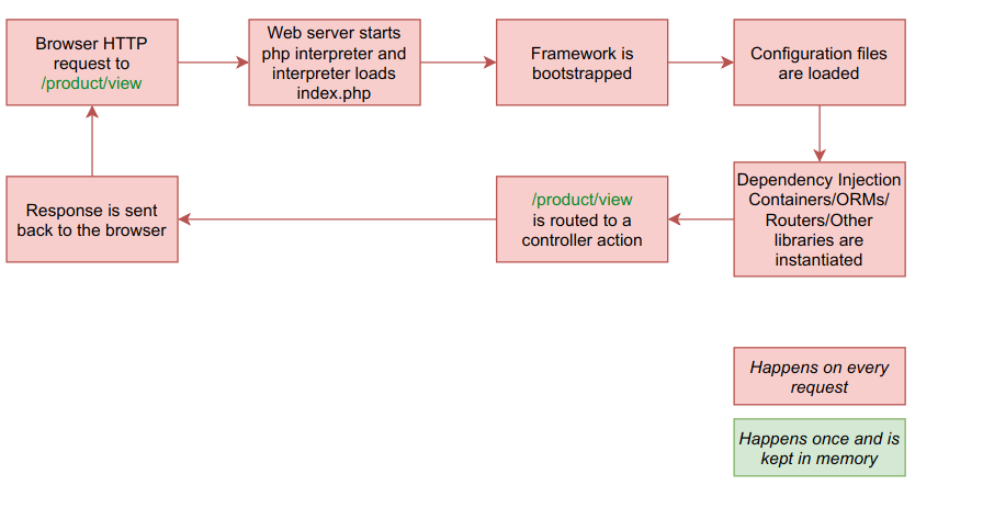 The only thing that happens differently on each request is the final step. All the (non-trivial) work of boostrapping the application is done on every single request. Each time a page is viewed, the classes are loaded, the framework is instantiated, database connected to, libraries configured. All of this hard work is done on every request. Every time you visit a page all the config files are loaded and classes instantiated.