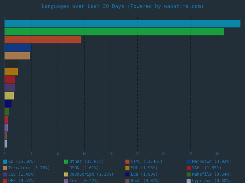 Neovim 25 hrs 55 mins βββββββββββββββββββββββββ 77.24 %
