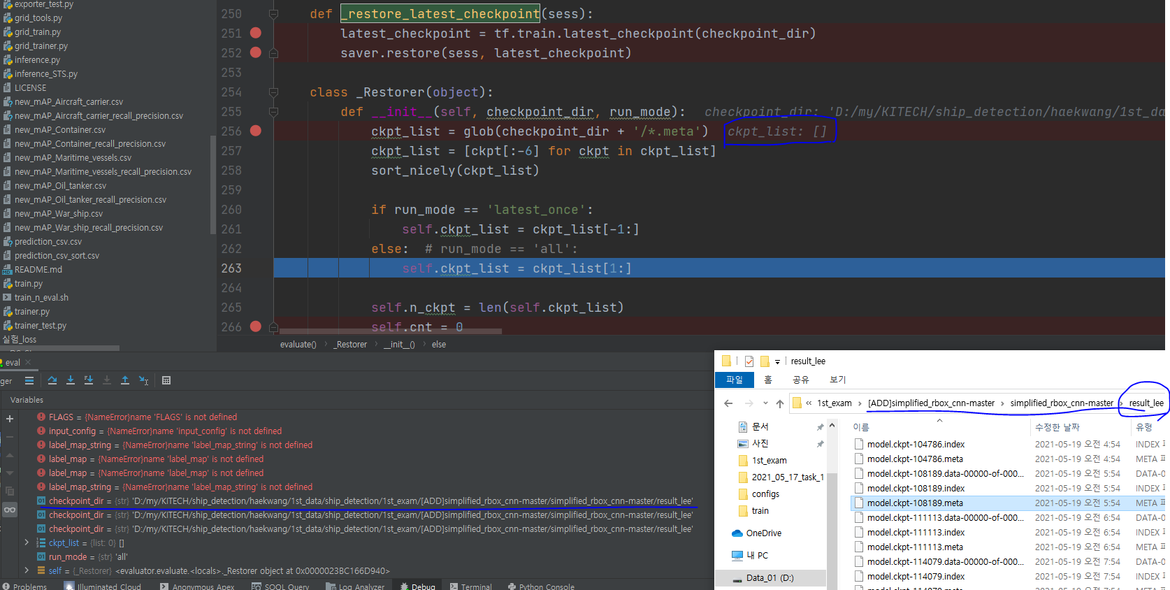 문제 원인 : 제 의견으로는 evaluator.py 파일에서 checkpoint dir에 있는 ckpt list를 불러오는게 안되는거 같습니다. 그래서 디버깅해보니 아래와 같이 ckpt_list 변수에 list가 할당이 안되네요.. 무슨 문제가 있는지 모르겠습니다. 경로랑, 소스코드엔 문제가 없어보이는데요.