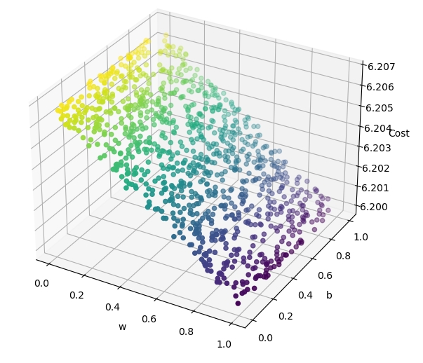 If we plot the cost function with respect to some random values generated for w and b we can see graphically that there is indeed a place (or a direction), towards which our L function tends to decrease in value