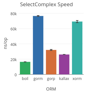 BenchmarkGORMSelectComplex/gorm-8     20000    76284 ns/op   34566 B/op   521 allocs/op