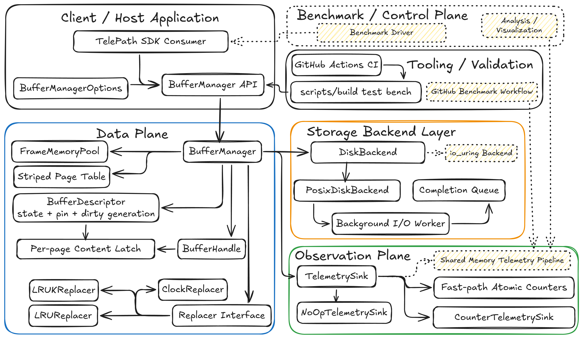 TelePath (Telepathy, Telemetry + Path) is a research-oriented C++17 SDK for building an observable buffer pool and page cache engine for modern storage environments.