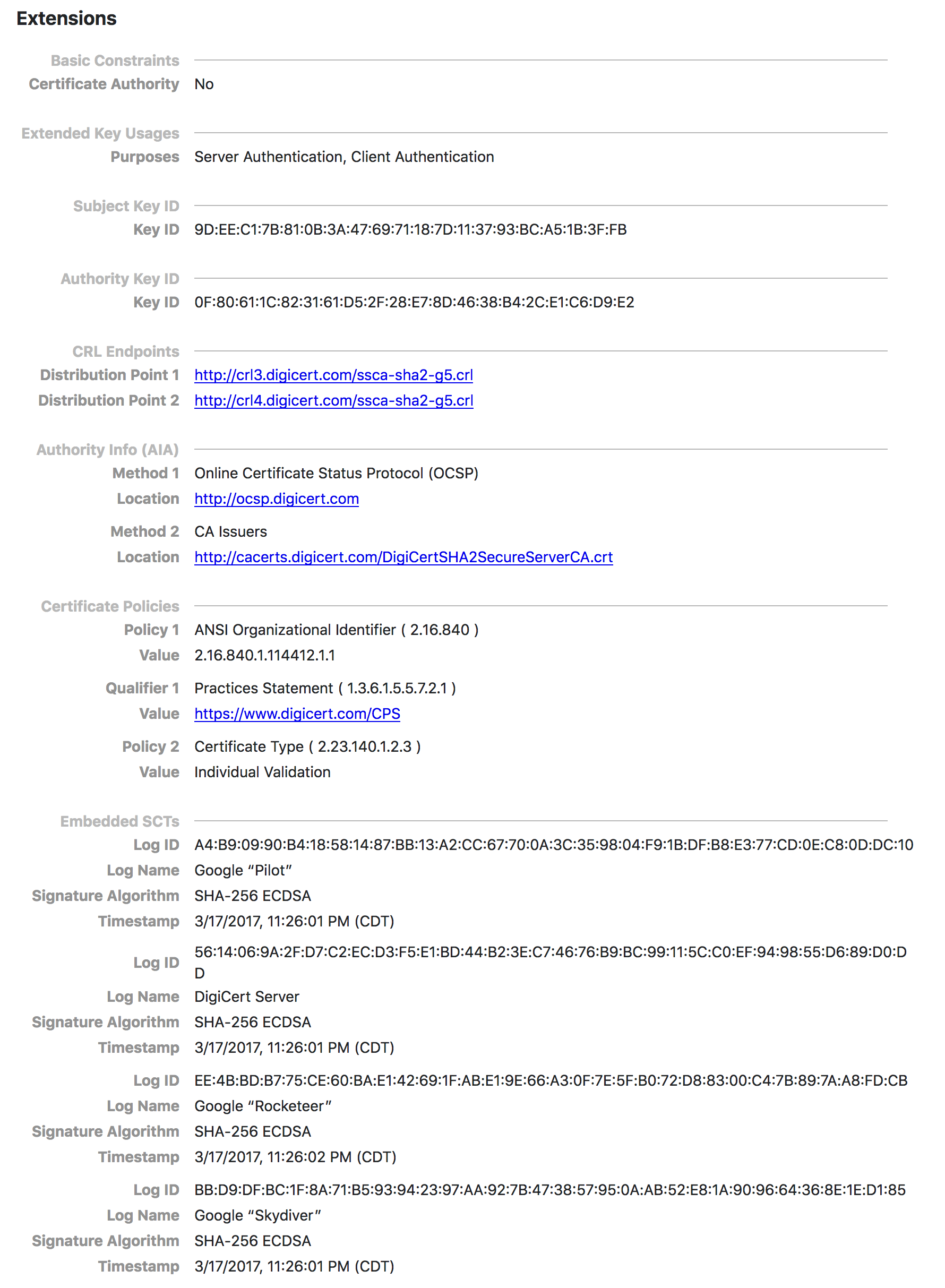 - Embedded SCTs, including CT log names
