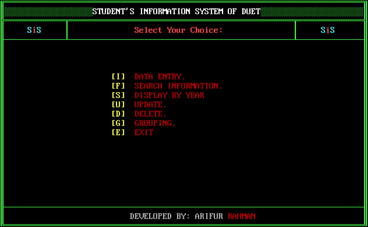 This C++ project can insert, search, update, delete, grouping information. It store data in a binary(.BIN) file. It will execute Turbo C++ 3.0 to upper version.