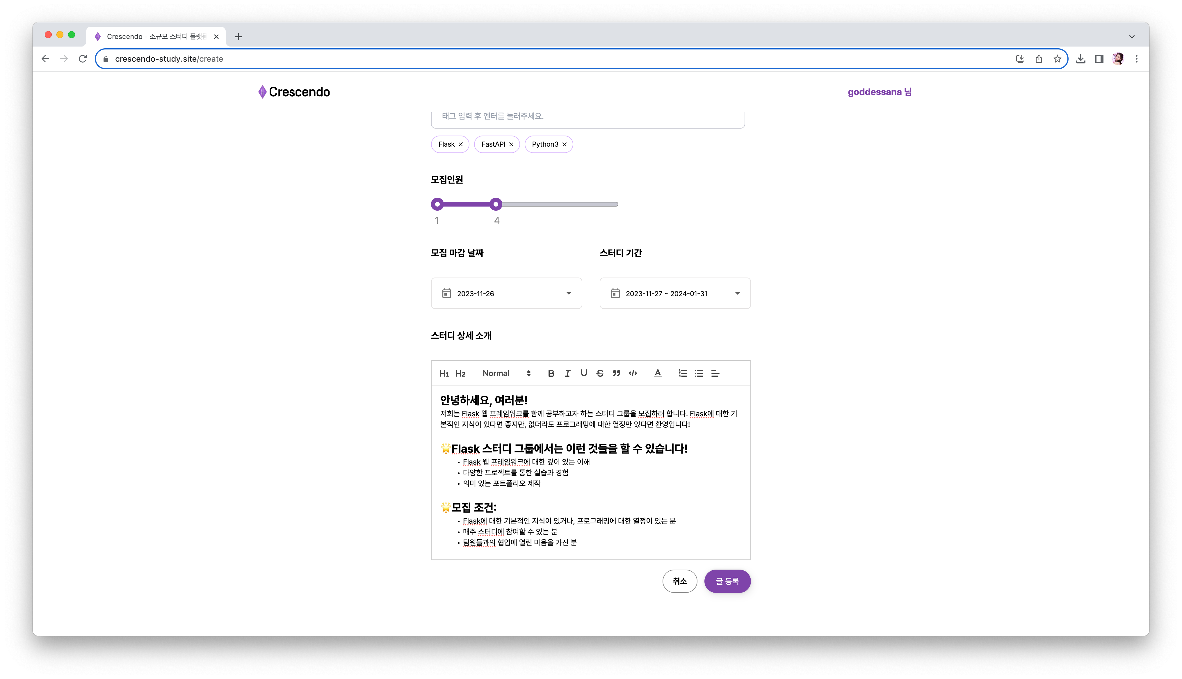 - 스터디 모집글을 올린 직후부터 등록이 가능합니다.