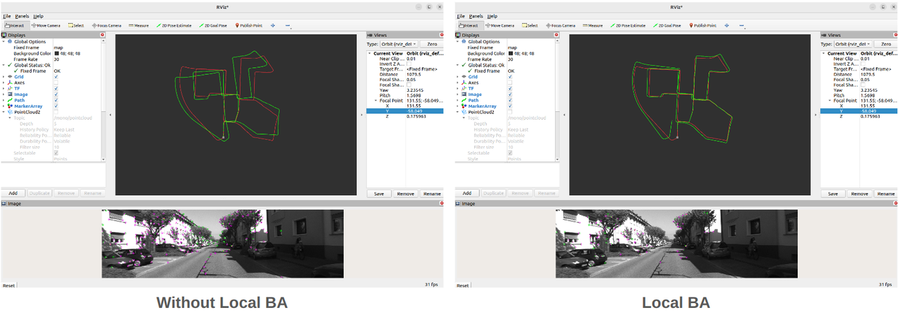 - Local Bundle Adjustment: Employs the g2o library to optimize the positions of keypoints across multiple frames.