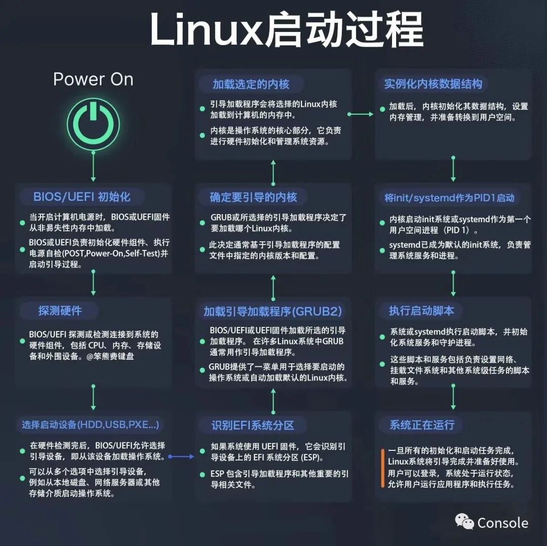 - Linux内核启动,运行用户环境,systemd将成为第一个用户空间的进程。用于管理系统中的进程和服务,并挂载文件系统。