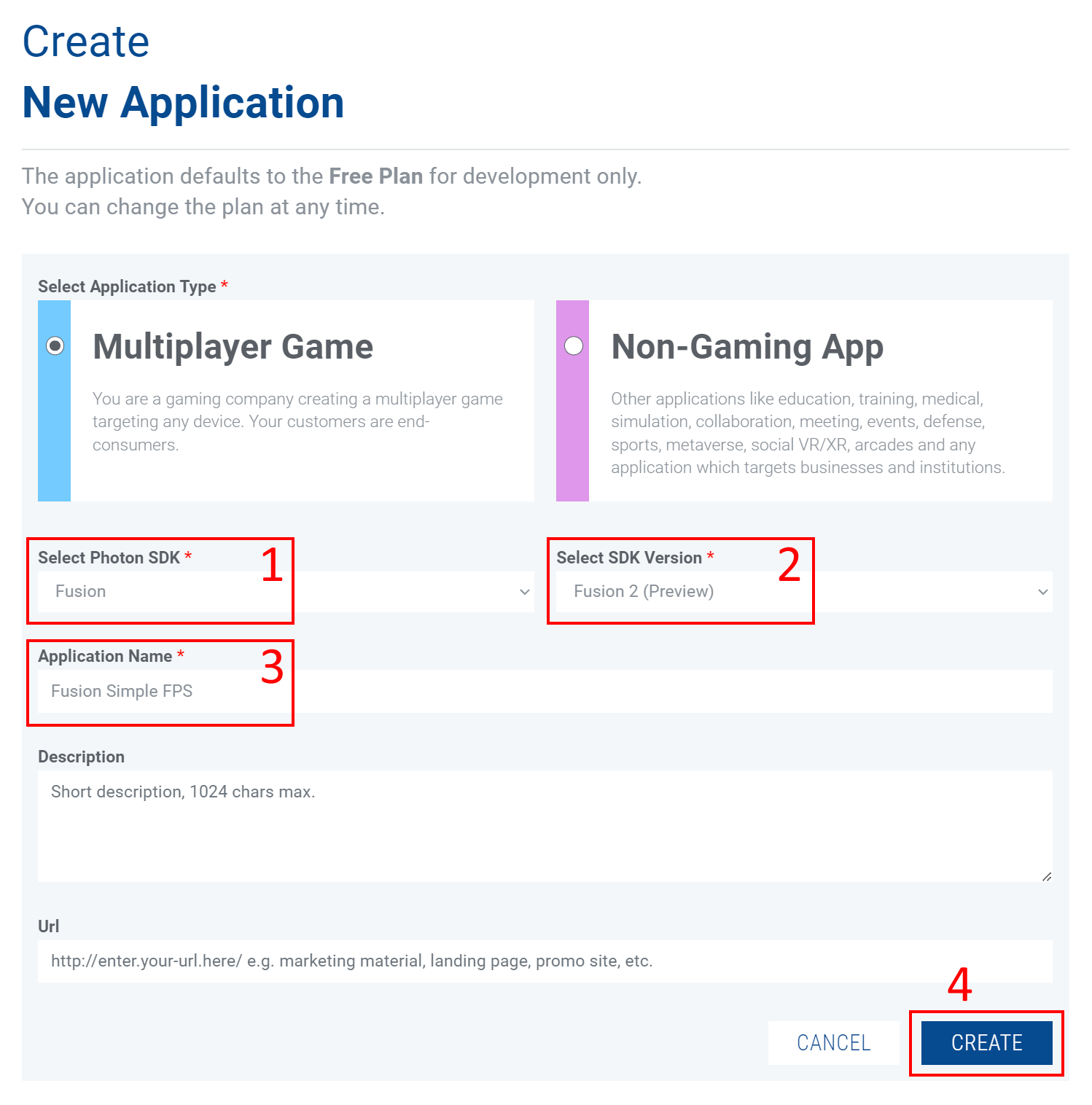 If you don’t already have one, you’ll need to create a Photon account to start using Photon Fusion. After you have an account, log into the Photon Dashboard and create a new Fusion 2 application.