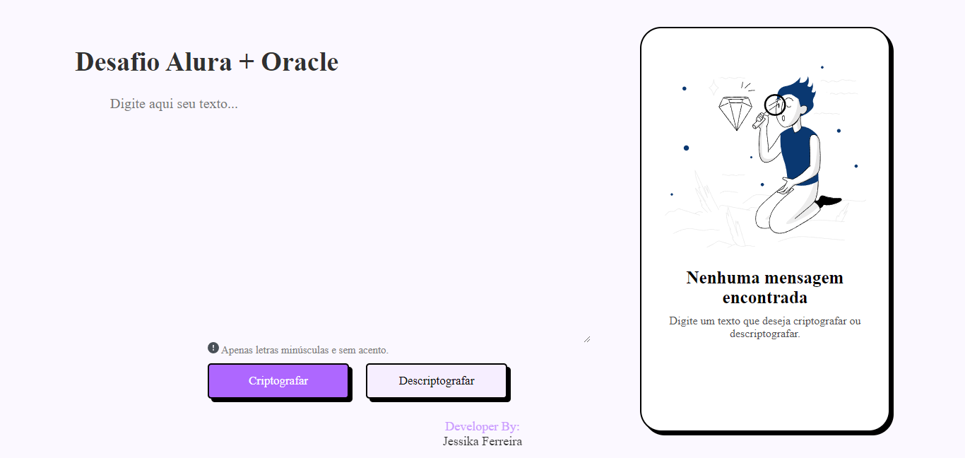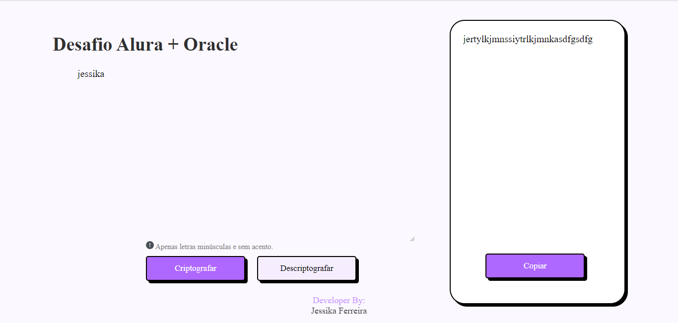 1º desafio da jornada #OracleONE, a proposta do desafio consiste em criar um decodificador para criptografar e descriptografar mensagens de texto. Na página existe uma tag textarea para entrada e outra para saída de textos. O usuário digita um texto qualquer na área de entrada e clica no botão criptografar, e a mensagem irá ser criptografada e o resultado será exibido na tag textarea de saída, junto com um botão copiar, para copiar o texto para a área de transferência, sendo possível fazer o caminho inverso, de descriptografar.