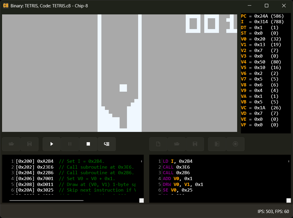 - A user interface capable of loading, running and debugging CHIP-8 programs