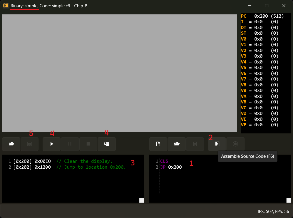 JP 0x200You can assemble this code into an executable using the provided debugger: