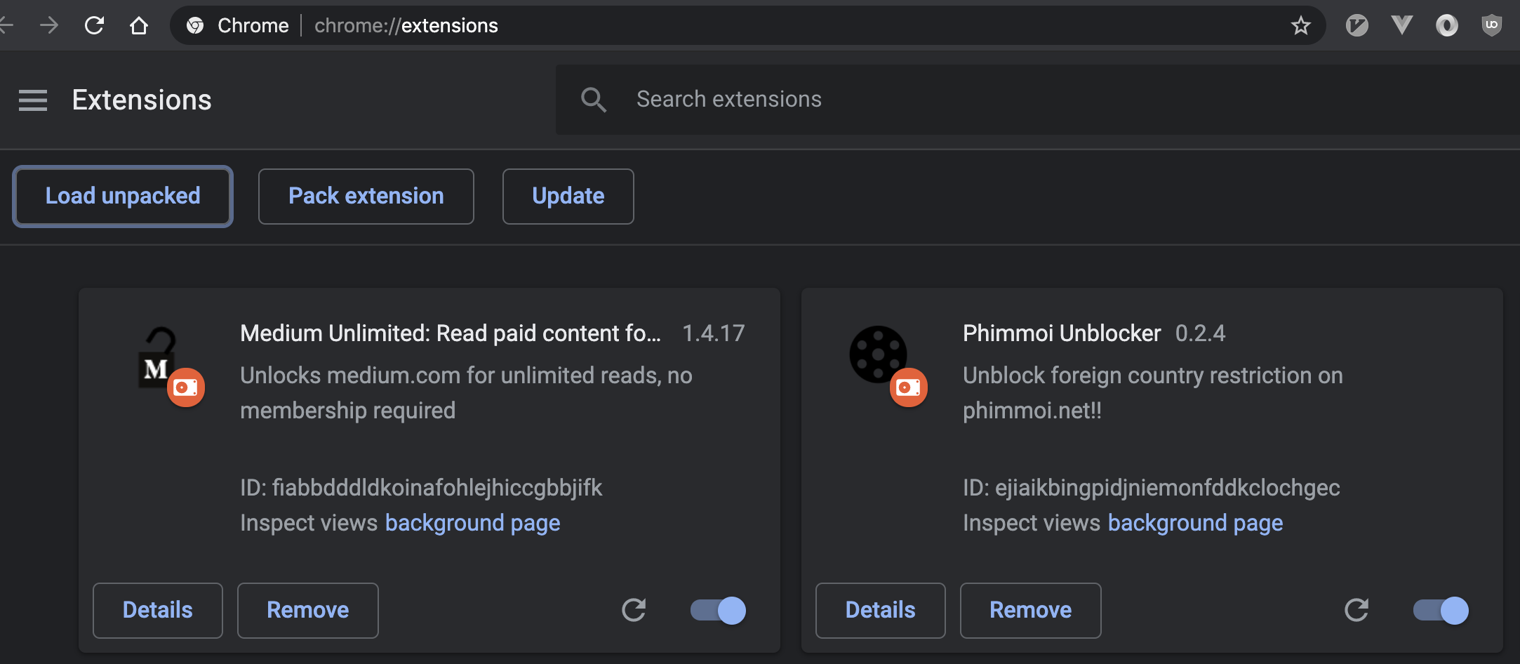 - Click on Load unpacked, choose phimmoi-unblocker folder and enjoy it :)