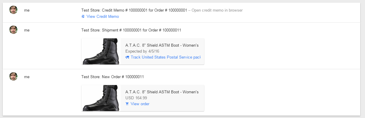 Increase user-engagement in your Magento stores transactional emails. Adding schema supported by Gmail adds quick go-to buttons to your customers inboxes. For more info see: Gmail Actions