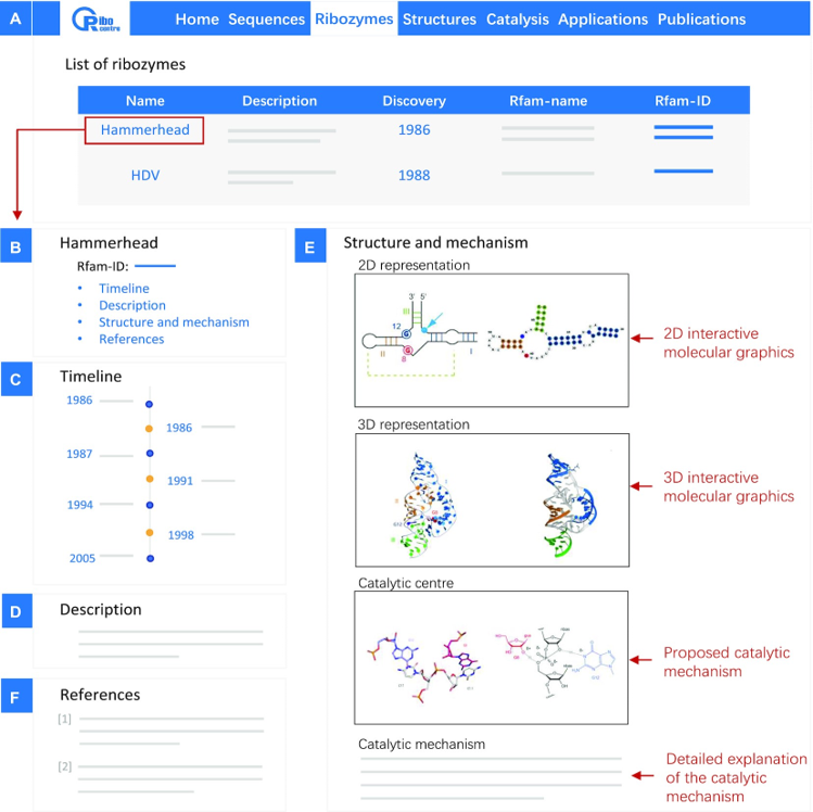The Ribozymes page at Ribocentre. (A) A list of 21 ribozyme families are shown on the page. (B) Clicking on the ribozyme name brings up the information page for the chosen ribozyme. (C–F) The timeline, description, structure and mechanism, and references for the hammerhead ribozyme.
