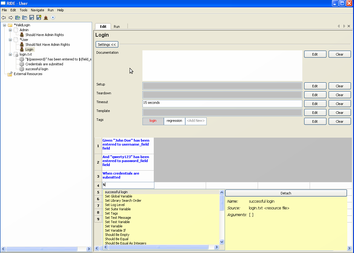 For keyword completion to work the library or resource containing the keyword must be taken into use and be found by RIDE. How to accomplish that is explained in the subsequent sections on this page.