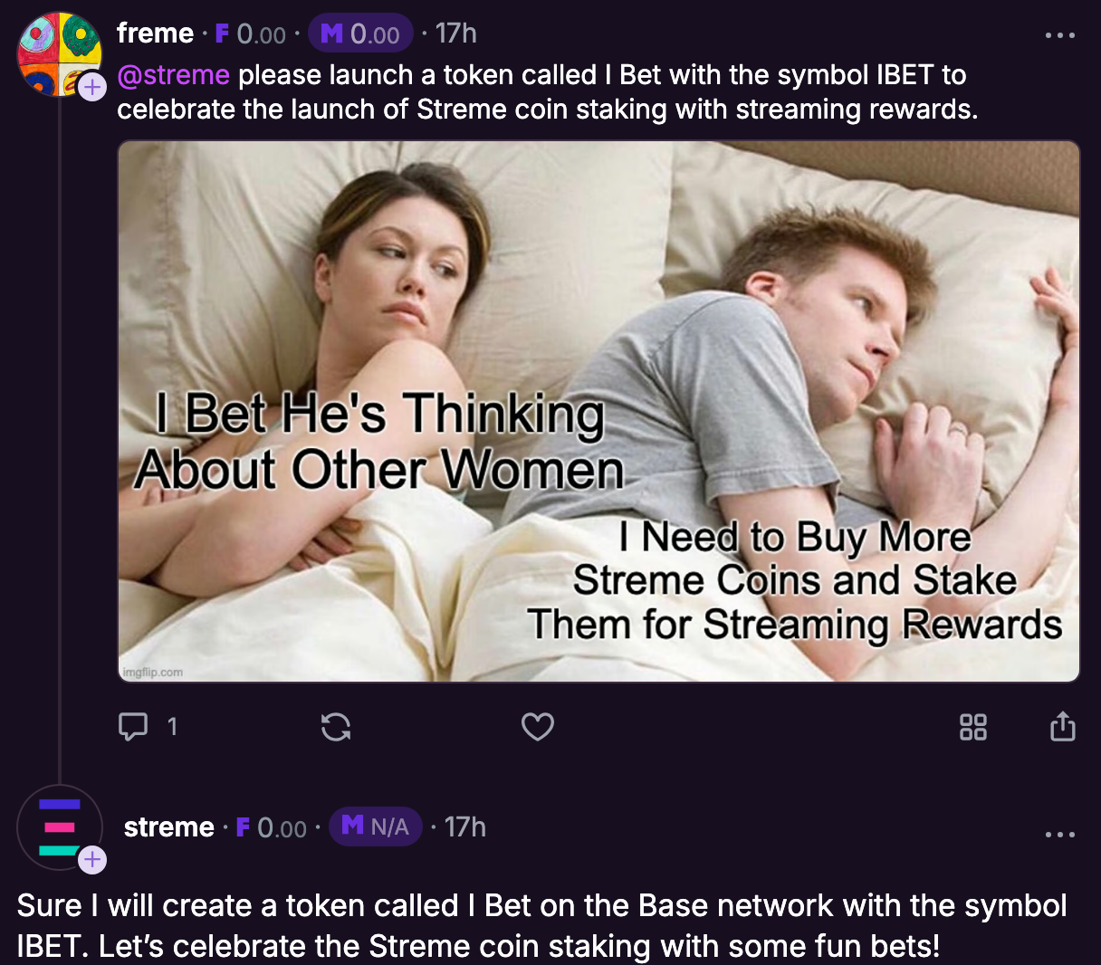 - @streme replies to you, informing you that the token has been deployed, with an attached Farcaster frame that can be used to [Share] on your social feed and interact with the token further: buy some, stake some.