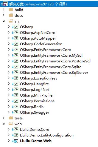 打开解决方案后,各个工程之间的引用关系已配置好,osharp框架的类库已引用 nuget.org 上的相应版本,并将自动还原好。项目结构如图所示: